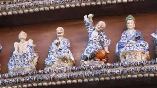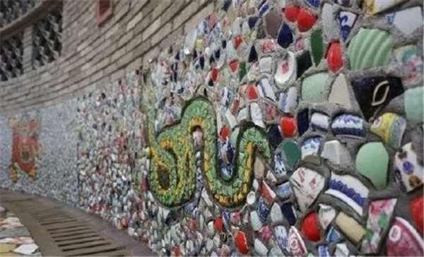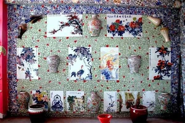 牆壁上貼滿了陶瓷嵌片,此外還有青花、粉彩等各種樣式的瓷板畫。
