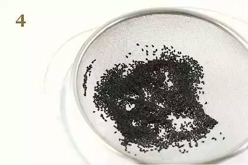 3.再將稀爛的果肉倒入短絲襪,繼續搓揉幾下,接著就泡水1天,不可泡水兩天以上,否則會發芽,隔天再繼續搓揉,可使果肉全部擠出,只剩黑色的種子,看起來有點像黑芝麻。