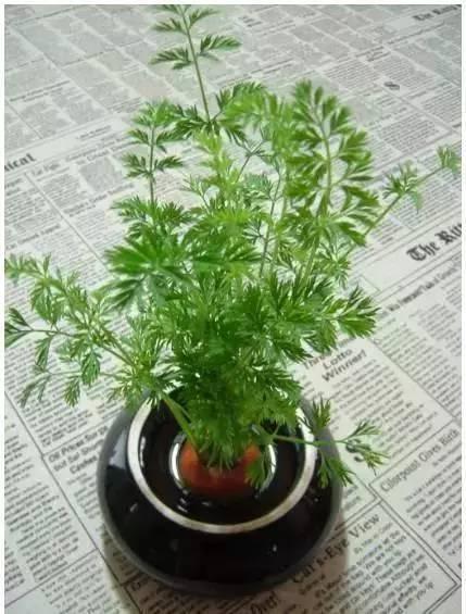 切菜時把一隻好看又肥碩的胡蘿蔔頭部忍忍心切下一大塊,扔在水器中,由它瘋長到這樣。