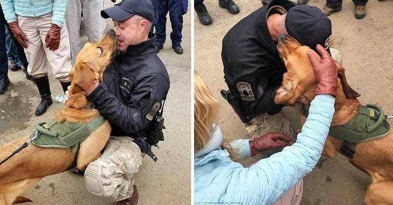 搜救犬的隊友開心又激動地抱著牠,不敢相信能再次見麵...忍不住留下淚水!