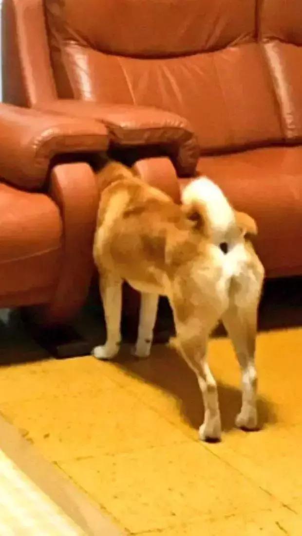 主人擔心得開始尋找柴柴,房間裡沒有,於是來到了客廳,看到了這傻眼的一幕,差點笑瘋了...難怪沒有聲音,Yume的頭被「沙發怪」夾住啦!堅強的Yume正在經歷牠這輩子汪生的小磨難!
