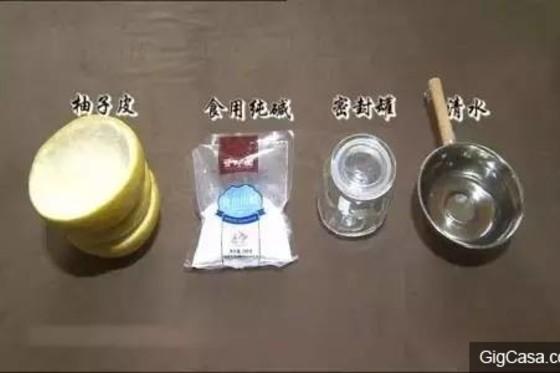▼需要的材料有:柚子皮、食用鹼、密封罐和清水。