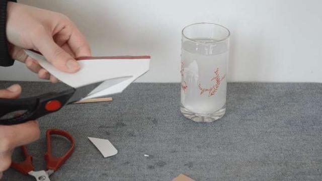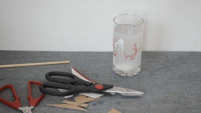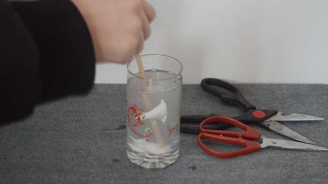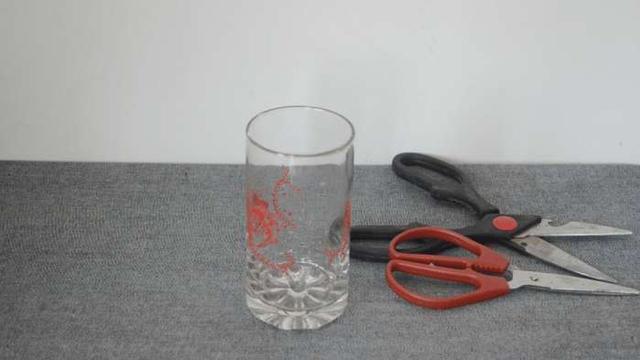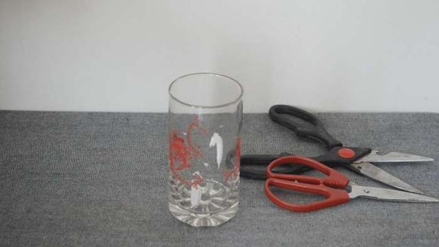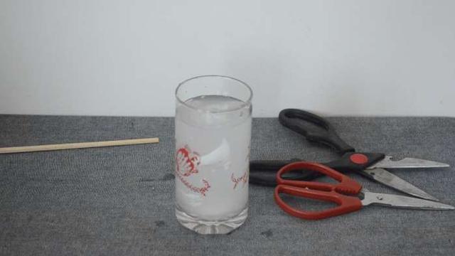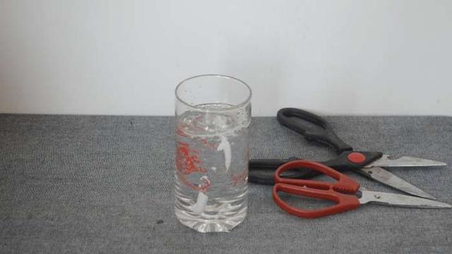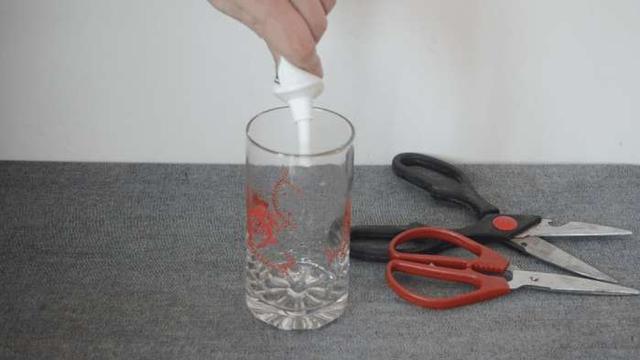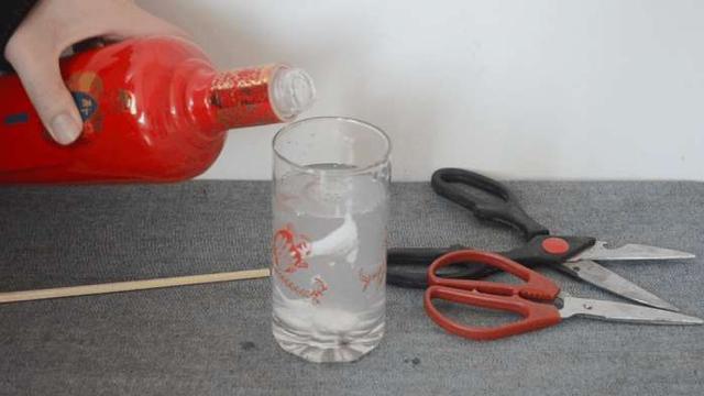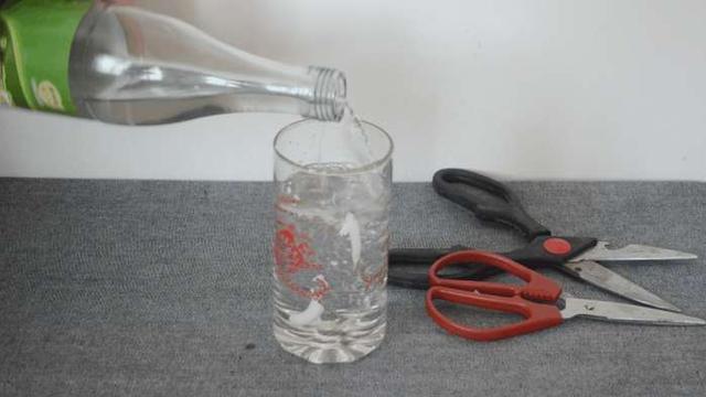 然後再往杯子內倒入白醋,白醋的量一定要讓剪刀的刃苗完全浸泡在裡麵就可以了。