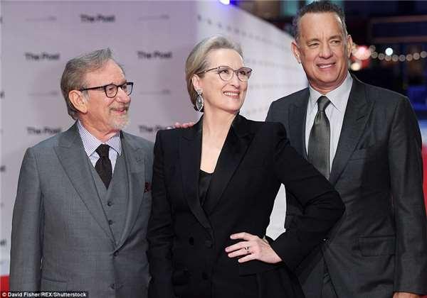 這部電影三人組個個是大腕,梅姨之前露面宣傳,穿McQueen的雙排扣黑色正裝,由導演史蒂芬·史匹柏,男主湯姆·漢克斯給她當綠葉,氣場太強大了。
