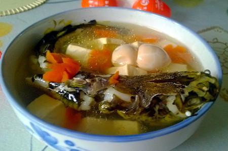 食材:黃甲魚300g、豆腐150g、生薑15g、鹽適量、紅蘿蔔80g、鵪鶉蛋45g、胡椒粉適量