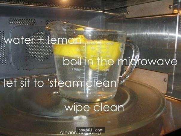 ▼2. 微波爐使用久了,裡麵又臭又髒怎麼辦?把幾片檸檬放置杯裡,之後再加入半杯水,接著放到微波爐微波10分鐘後,關掉電源再放置10分鐘,接著,就可以拿抹布把微波爐裡的汙垢給擦幹淨了!