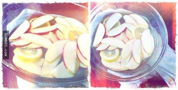 ▼3. 切好的蔬菜水果接觸空氣一段時間後,會變黃變色怎麼辦?只要把檸檬片和水果放在一起泡水,水果就不會變色了。