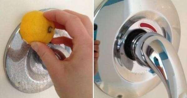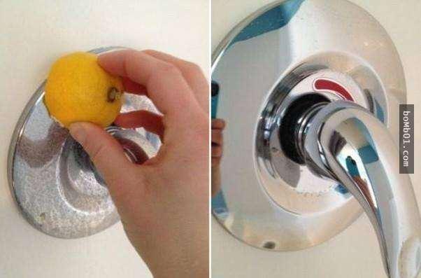 ▼12. 浴室裡的水漬怎麼洗都洗不掉?拿出半顆檸檬在水漬處擦拭,簡單清除水漬。