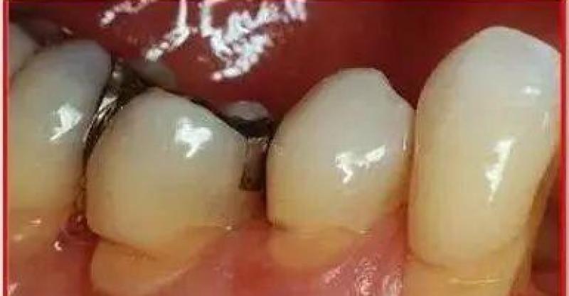 病例三:女,34歲。由於她特別喜歡使用硬毛牙刷、用力橫刷,這樣長期採用拉鋸式橫刷牙的方式,牙齒表麵形成楔狀缺損。她已經較嚴重,引起牙髓炎了,需要根管治療以後再充填修補。
