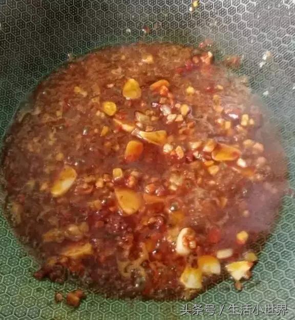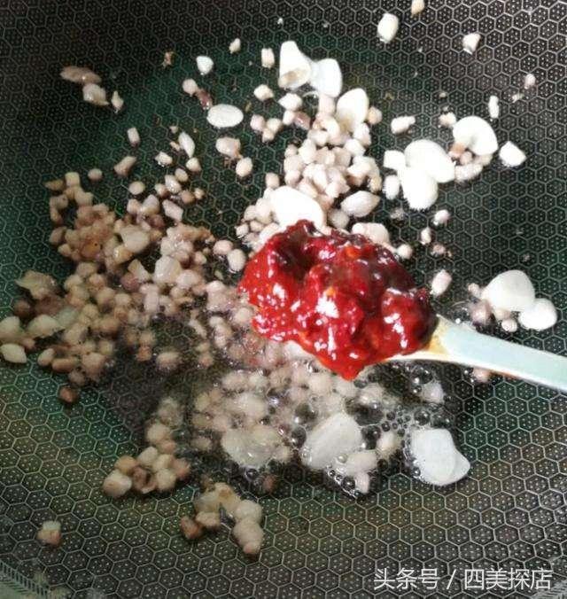 9、還有蒜蓉辣醬加肉丁一起翻炒。