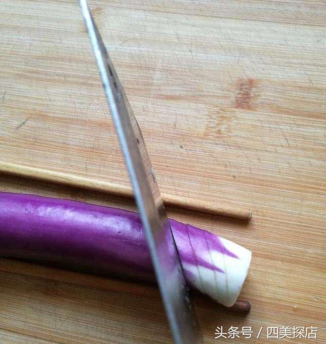 3、然後開始切茄子,茄子去頭去尾,準備一雙筷子夾住。