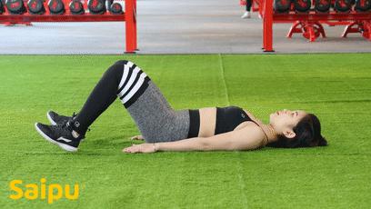 ▼3. 臀橋:仰臥在墊子上,雙手伸直放在身體兩側,屈膝90度左右,腳後跟支撐在地麵,腳尖離開地麵;吸氣準備,呼氣腹部收緊,臀部發力,將骨盆往天花板方向頂,吸氣還原。重復15-20次,做4組。