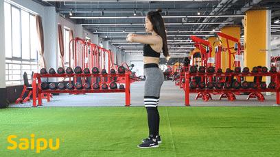▼1. 徒手深蹲+轉體:自然站立,兩腳分開與肩同寬,雙手屈肘抬至肩的高度;吸氣臀部向後移,屈膝慢慢下蹲,蹲至大腿與地麵平行,呼氣臀部和腿部發力,將身體還原至初始位置並向一側旋轉。重復動作15-20次,做4組。