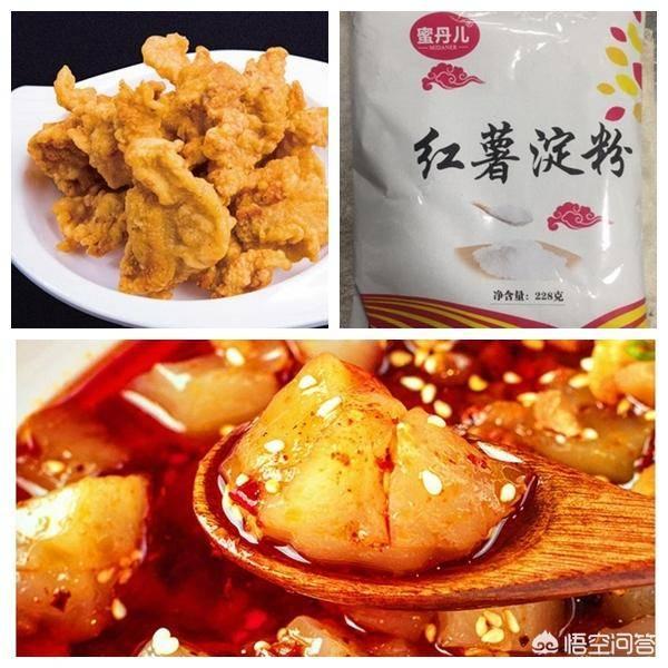 地瓜粉:也叫紅薯澱粉,是地瓜磨成的粉,因為融於水加熱會呈現粘稠狀,粘性比太白粉更高。勾芡時很少用地瓜粉,但是常用來製作中式點心,可以炸酥肉呀,做地瓜餅,涼粉等。