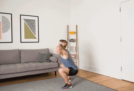 雙手抱頭,深蹲跳躍。