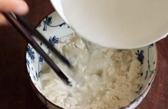 碗中加入適量麵粉,然後加食用鹽和白胡椒粉,加水攪拌成麵糊。
