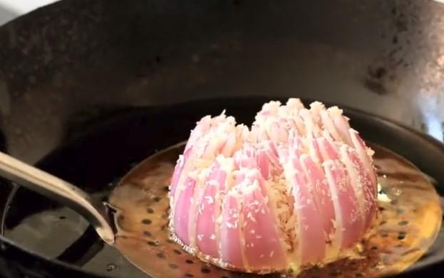 炸的時候用勺子把熱油不斷的澆在洋蔥上麵,一點要多澆,這樣洋蔥就可以開花了。