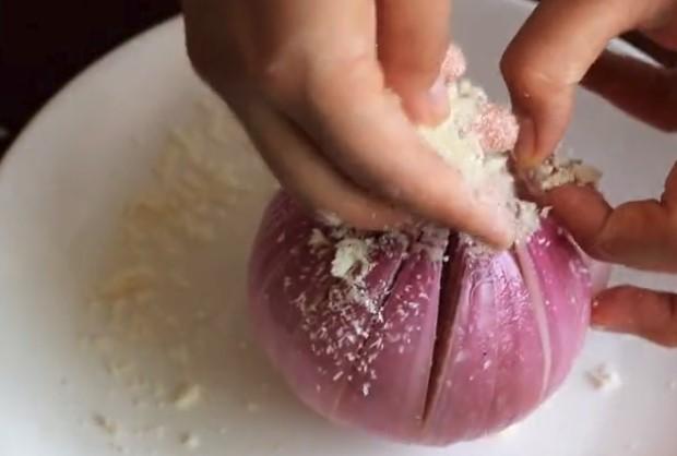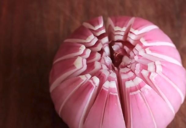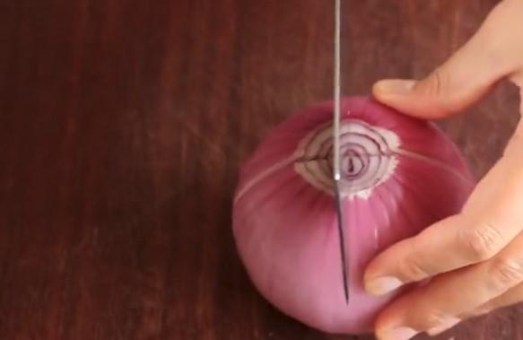 準備一顆洋蔥,從中間切來,但是不要切斷。