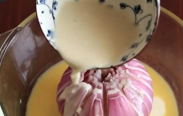 蛋液淋到洋蔥上麵,儘量淋的均勻一點。