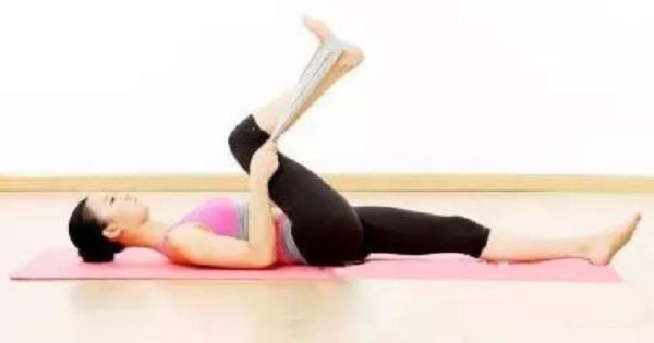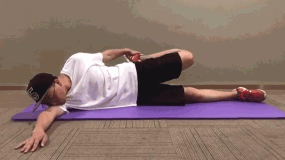 如圖所示,側躺,用一隻手向後拉同側的腳,拉伸 2 次後換一邊。