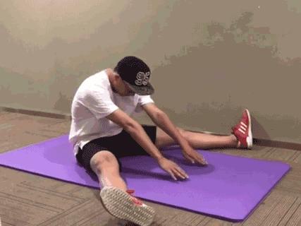 如圖所示,坐下然後把腿分開伸直,緩慢地向前伸直雙臂,俯身彎腰。