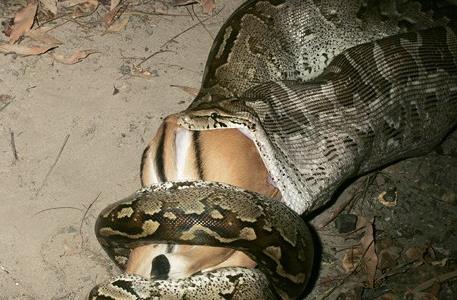 成年的綠水蟒可以很容易的纏住並吃掉一條一米多長的凱門鱷