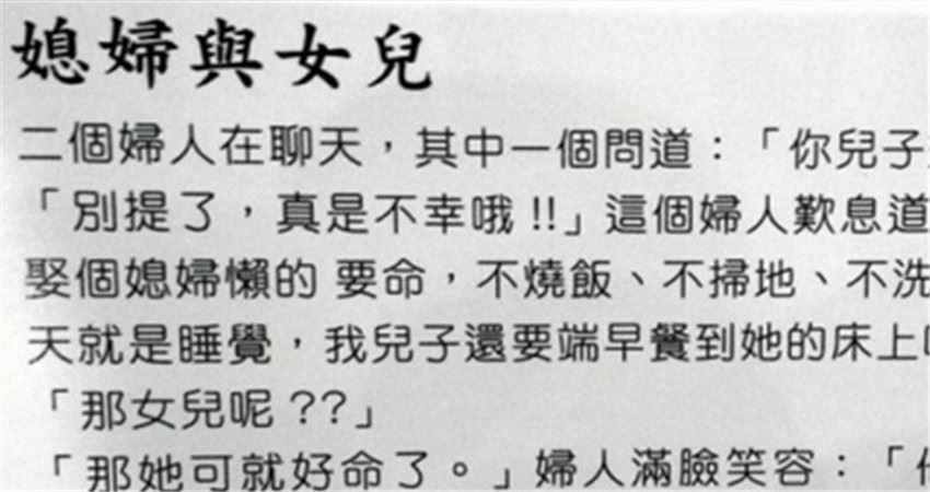 臉書粉絲團《靠北婆家》即列出了15點媳婦與女兒的差別,讓許多為人媳婦者心有戚戚焉。