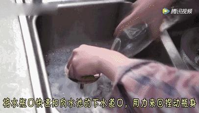 快速將瓶子倒扣進下水道,同時用力捏壓瓶身,這時瓶子裏的空氣會被灌入下水道中,在水壓的作用下,堵塞物很快就被推走,下水道立馬暢通起來。
