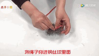 根據下水道的大小,將廢棄的鋼絲球剪開,取出其中的一塊,用繩子穿過鋼絲球,打個死結。