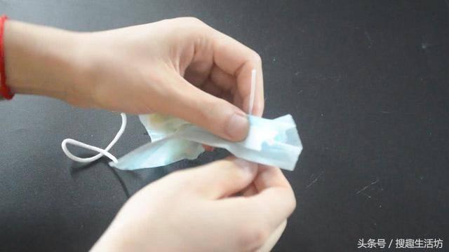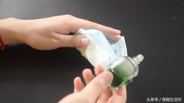 接著往一次性口罩裡麵的大蒜上倒一些風油精,並且把一次性口罩的開口紮起來。