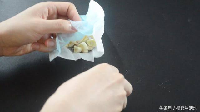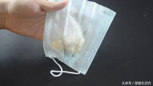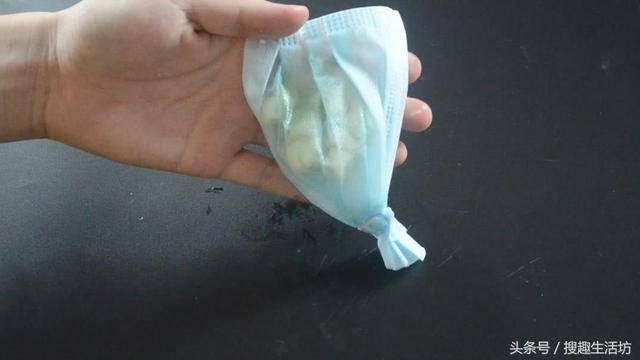 然後把一次性口罩剪上一刀,將切丁的大蒜裝進一次性口罩內。