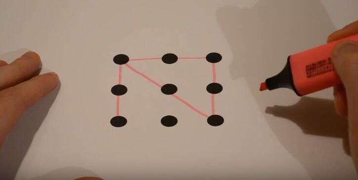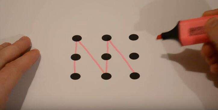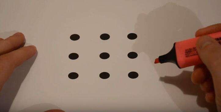 ▼這道題目的要求是,用4條直線將白紙上的9個點全部連起來,要一筆劃完成。據說全世界只有20%的人可以在3秒鐘內解出,快來測試一下你的智商吧!