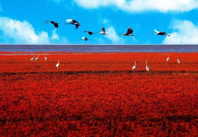 ▼中國盤錦,紅海灘:紅海灘歷史悠久,有學者認為,大海出現的時候就有紅海灘了。