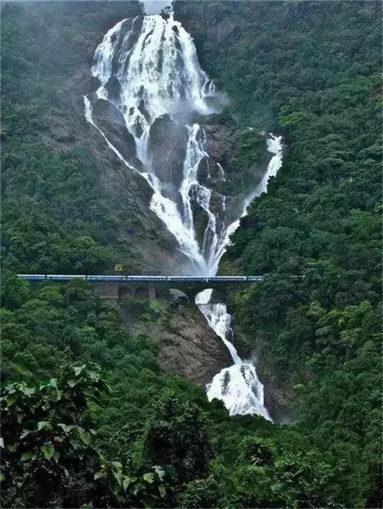 ▼印度,果阿瀑布前的鐵路:筆直的鐵路就像把瀑布攔腰截斷一般。