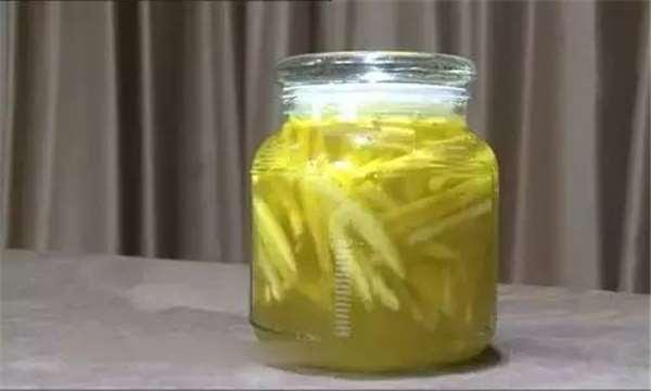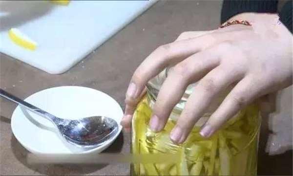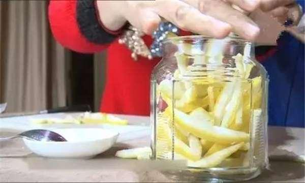 先把柚子皮的白色部分去掉一些,切成絲放進瓶子裡。