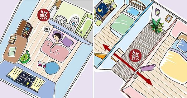 臥房中的床頭後方是廚房、走道或廁所;或者床頭、沙發、書桌坐椅上方有橫樑,
