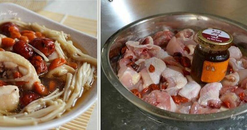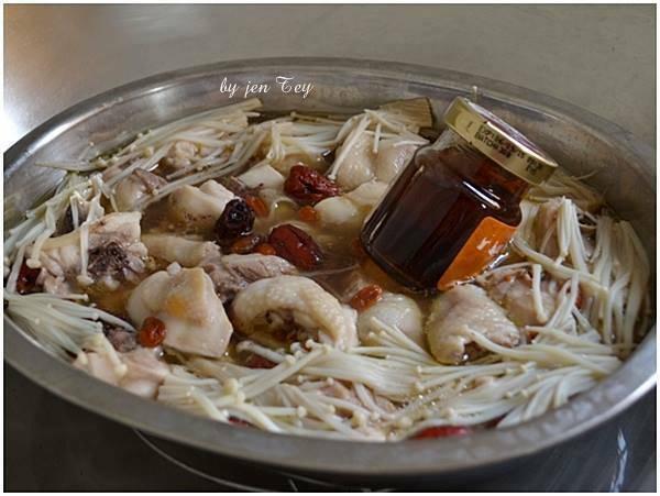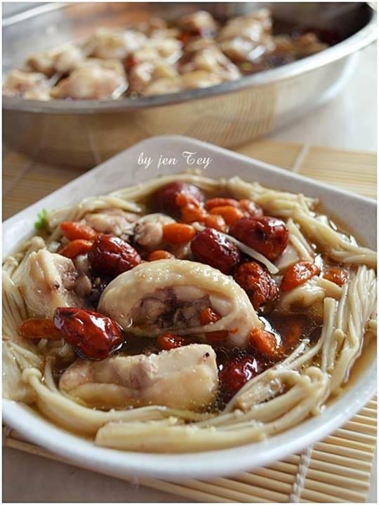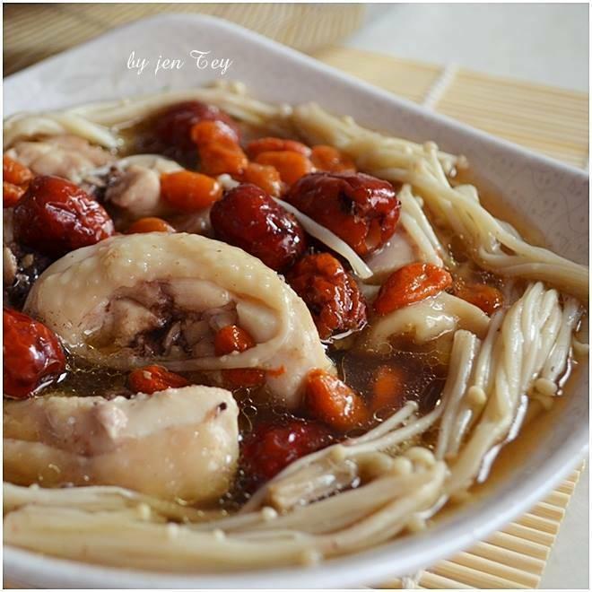 【食譜】:【材料】:全雞腿 3個 斬塊金針菇 1包紅棗 1/3碗枸子 1/3碗雞精 1罐(喜歡味道濃的可放2罐)紹興酒 1湯匙鹽 隨意清水 1/3 碗【作法】: