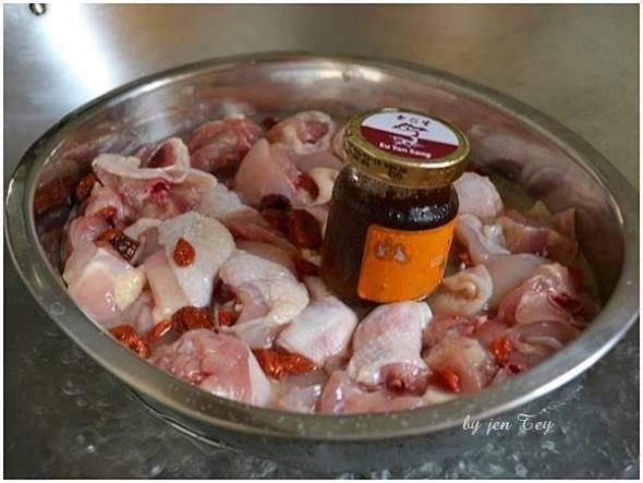 紅棗和枸子先下深盆中鋪排均勻。雞肉放在紅棗和枸子上麵,鹽和清水調和均勻,淋汁雞塊上,稍微挪動一下雞塊 讓鹽水流入盤底。最後在雞塊上淋上紹興酒,再把雞精瓶子清洗乾淨放雞塊上端,如圖所示(雞精先別開蓋)。