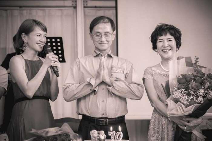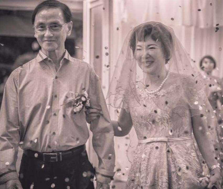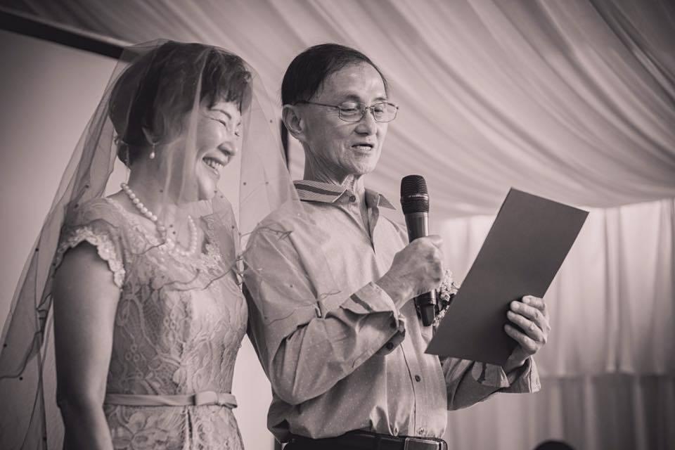 只見李心潔與弟媳幫媽媽戴上別緻的紅色頭紗,並事前準備了一份結婚宣言,倆老在眾人的歡聲中對彼此許下諾言,一句「我李綽森娶你黃燕莉為我的妻子,而這是我對你的承諾,我將對你忠實……,我們將共度順境、逆境,直到地老天荒。