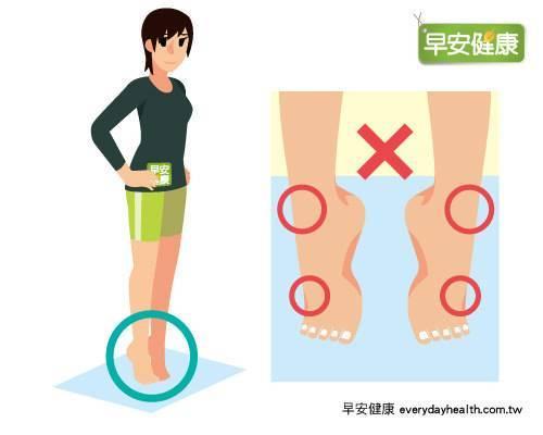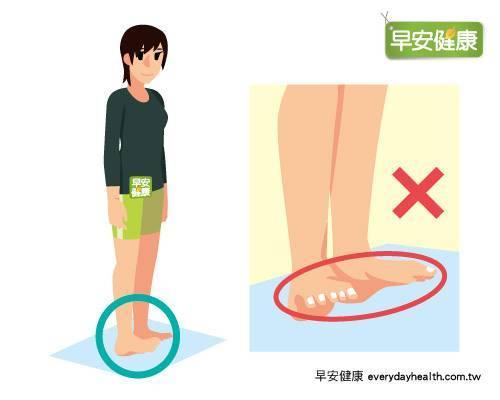 踮腳尖時要避免把重心撐在外側的小趾處,腳踝關節突起處要麵向側麵,而不是像圖上一樣麵向斜前方,否則也會分散體重重心。