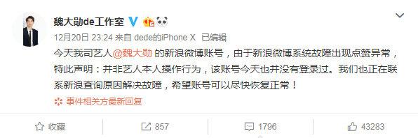 魏大勛工作室指出,所有按讚內容並非魏大勛本人所操作,「今天我司藝人魏大勳的新浪微博帳號,由於新浪微博係統故障出現點讚異常,特此聲明:並非藝人本人操作行為,該帳號今天也並沒有登入過。