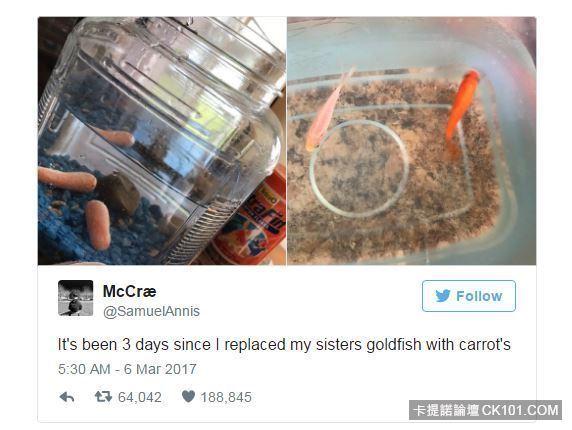 網友反應:「妹妹搞不好早就發現了,然後想到可能會這種貍貓換太子的事情的人只有哥哥還在等待哥哥來解釋 為何把金魚變胡蘿蔔想不到哥哥與她的小夥伴們已經炎上了」、「有個人每天幫忙餵食幫忙換水代價是假裝不知道是我也OK阿好一個心機女」、「不過妹妹還真是太混了 , 要是像養小倉鼠 , 不就被餓死了」、「記得要常常更換紅蘿蔔,不然會變死魚」