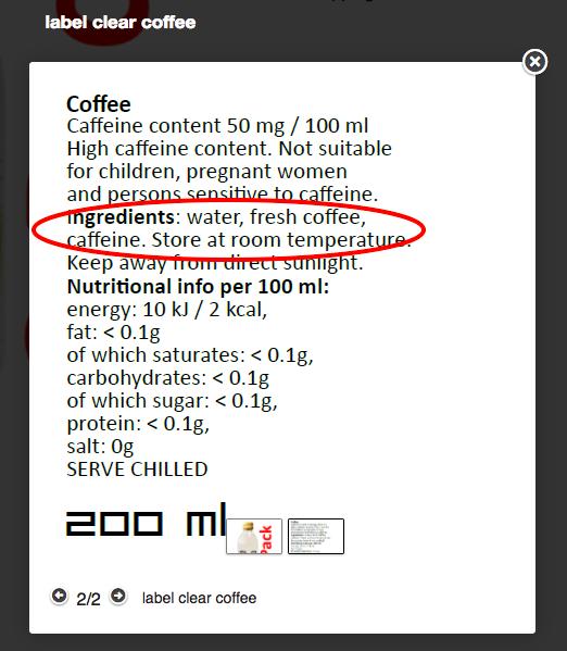 這一款咖啡選用高品質阿拉比卡咖啡豆調配而成,利用獨創技術去除咖啡裡的色素,原料更號稱只有水、咖啡豆、咖啡因,絕無防腐劑或其他人工添加物。