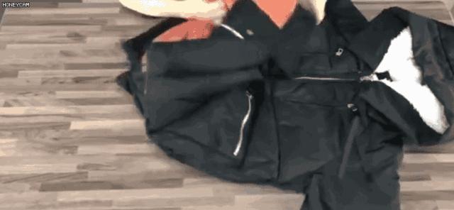 第一步: 將短款羽絨服從中間對摺一下,然後將袖子擺放在兩側。