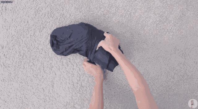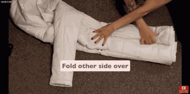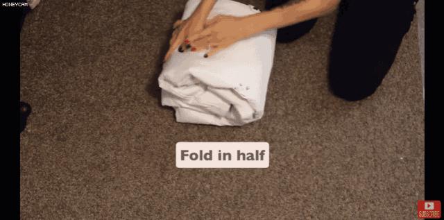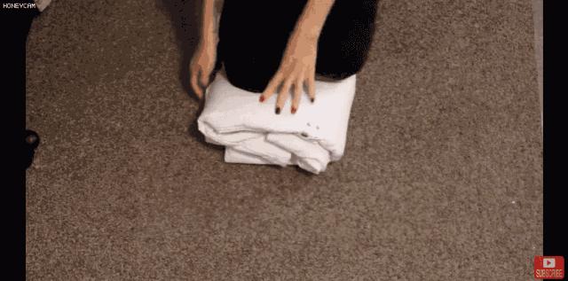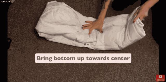 第三步: 將毛衣對摺兩次,然後將底部的彎折翻過來,包裹住毛衣對摺的地方。