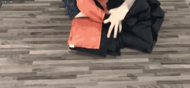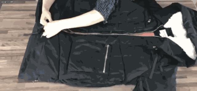 第四步: 用膝蓋不斷擠壓出羽絨服裡麵的氣體,並將羽絨服放入壓縮袋或者密封袋中保存。