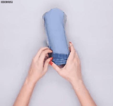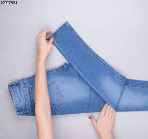 第二步: 將折起來的牛仔褲褲腿翻過來,套住整個牛仔褲。