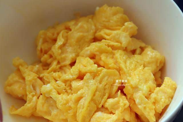 3、把煎製凝固的雞蛋用鍋鏟切塊後盛出裝碗待用。