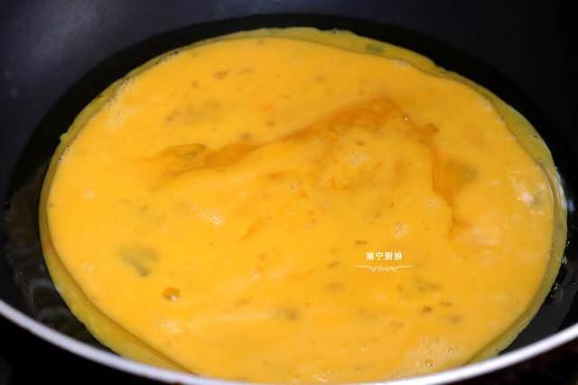 2、起鍋,在鍋裏倒入適量的油,開小火燒熱油,把雞蛋液倒入,慢慢煎至凝固。