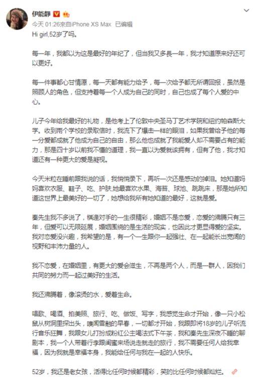(4)日是伊能靜的52歲生日,沒想到她淩晨突然在微博寫下,自己因為一封有關兒子的信而流下「爆擊般的眼淚」,其中為母的她還寫下對兒子真摯的告白,相當令人動容。